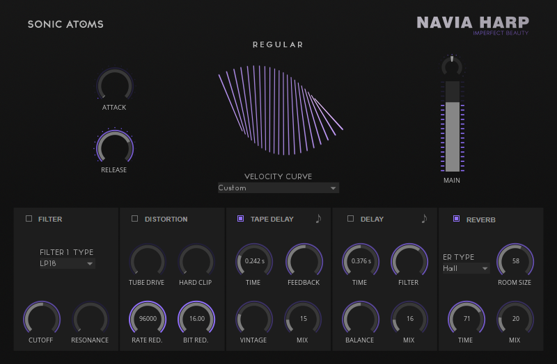 A Single Regular program, providing traditional plucked articulations with one dynamic layer sample. The volume and tone are controlled by velocity to mimic natural dynamic behavior, along with single round robin samples. In comparison, the full Navia Harp library includes three dynamic layers and three Round Robins for expressive variations.